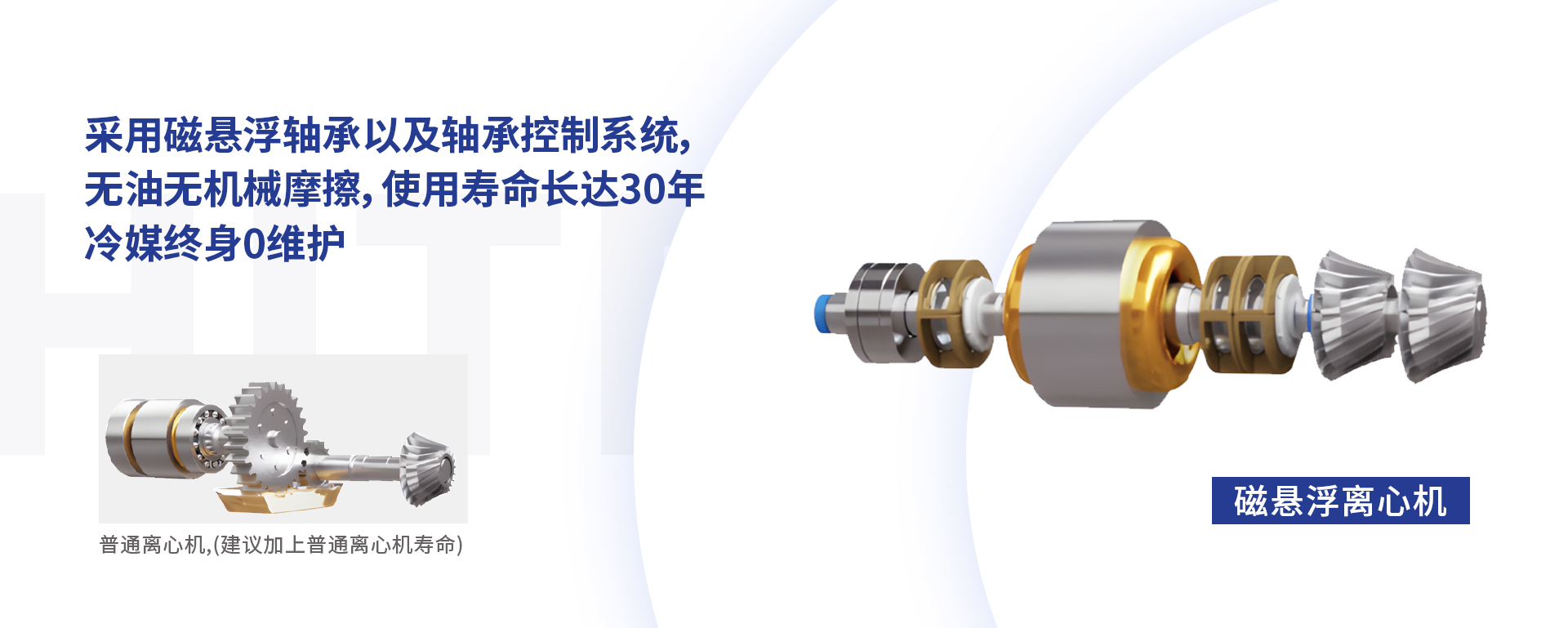 使用 磁悬浮技术 无油技术,避免摩擦和磨损,零油润滑、低噪音、高效率。